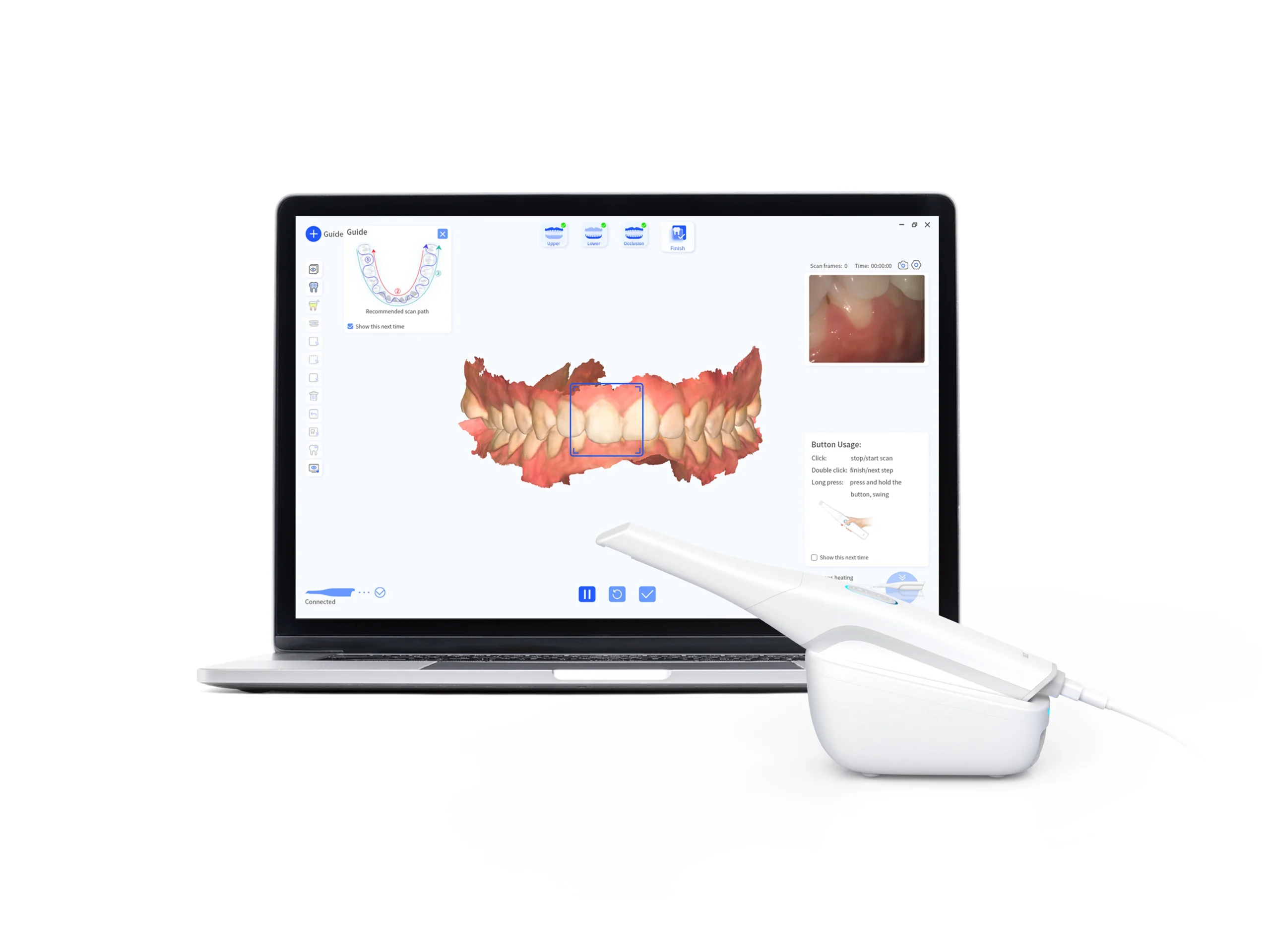 Conecta el escáner al ordenador mediante USB, abre el software y selecciona el modo de exploración. Mueve el cabezal por la cavidad bucal para capturar el modelo 3D en tiempo real.