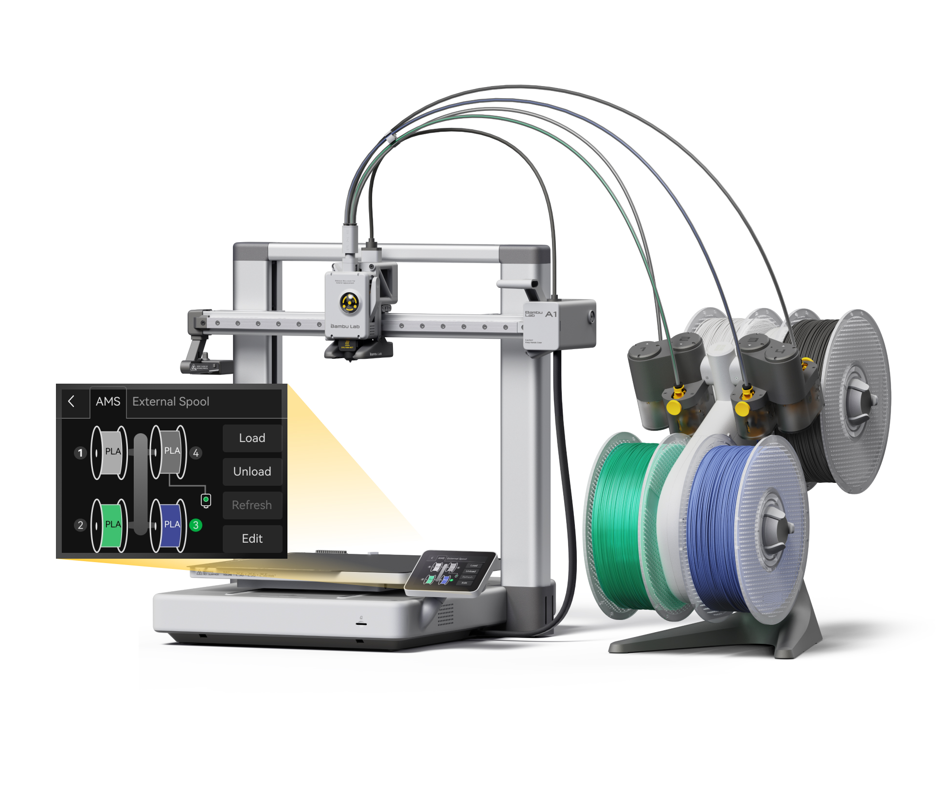 El combo de la impresora Bambu Lab A1C exprime al máximo las funcionalidades del modelo base gracias a su integración con el sistema AMS Lite, el cual le permite optimizar tu producción y desplegar un masivo desfile de hasta cuatro colores en tus impresiones 3D.